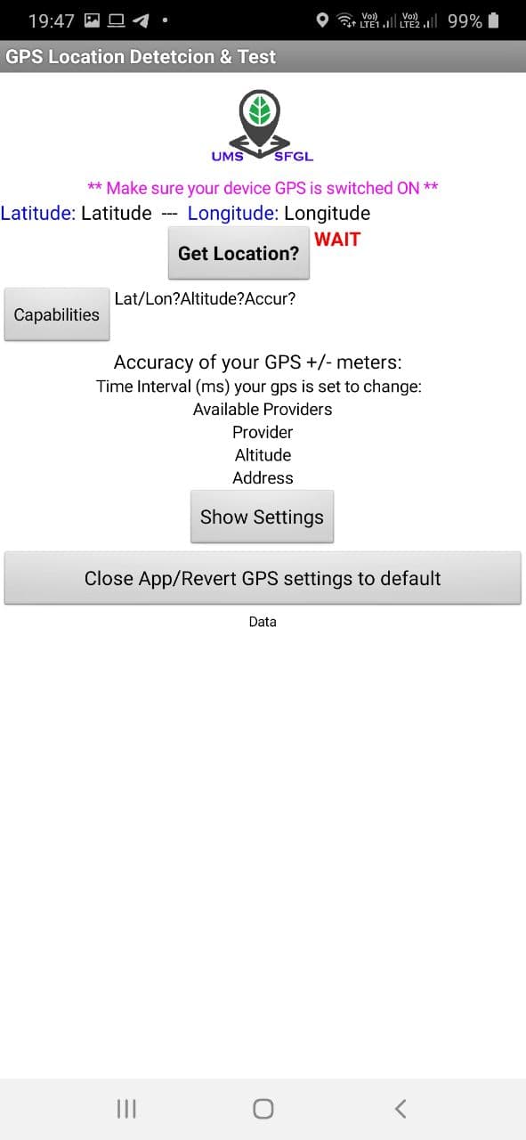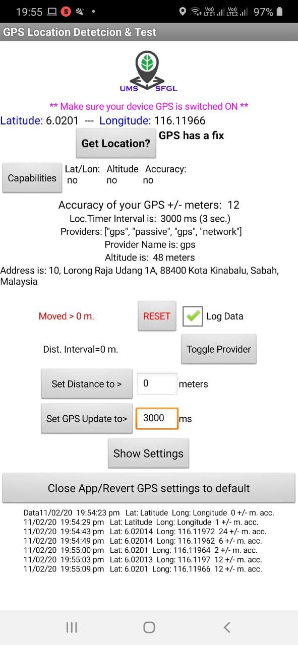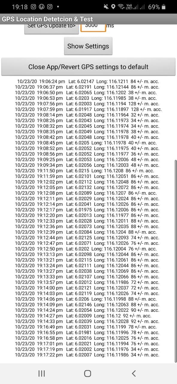 The developed app will perform a satellite fix with Android Devices which takes 30-40 seconds to achieve. The fix will also continue whenever the position changed with an event log is enabled. A reasonable time interval for the whole process will be 20000 ms.