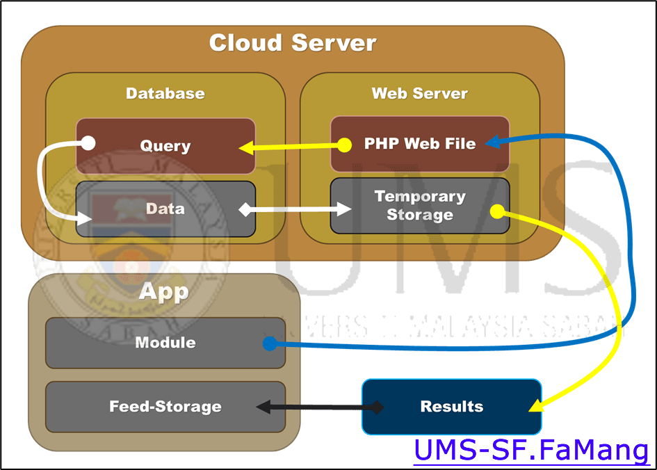 Figure 1 shows the overall architecture of the developed application. It require a cloud server hosted either locally or globally. It is initialised without a secure connection for development purpose. The process of the app will begin from the APP. User will perform actions from module to trigger the function from Web Server. It is then process a query to retrieve data from database. Successful query will return data and pass to a temporary storage. A parsing process will determine what type of data is required to feed from temporary storage in unformatted to a formatted value or text to Feed-Storage.